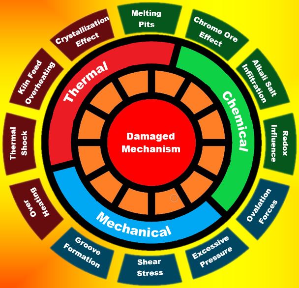 The relationship between service stresses in process equipments and the important properties of refractory bricks during service form the basic for damaged refractory assessment based on their appearance and morphology of damage. Generally, In order to determine the damage mechanisms we classified into (a) Thermal Stress ; (b) Thermo-technical ; (c) Mechanical ; (d) Chemical etc.