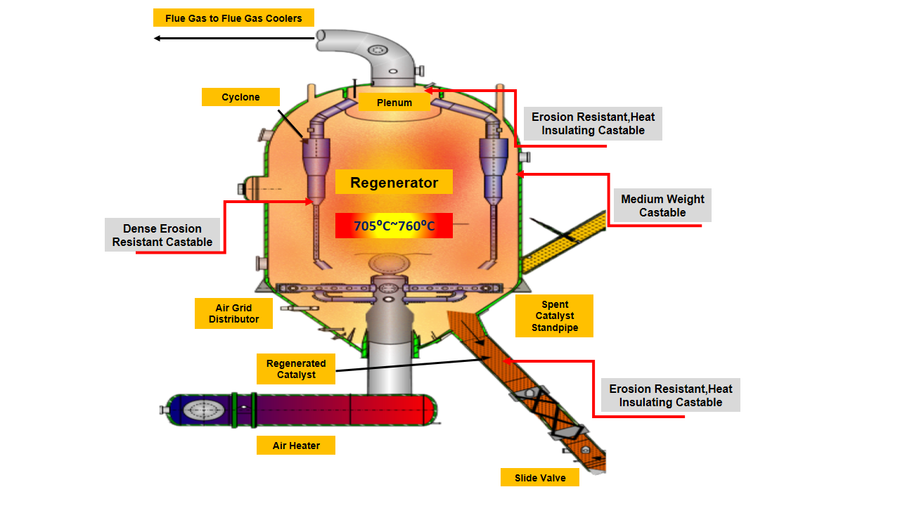 A vessels in which coke and residual hydrocarbons are burned off of the catalyst and the flue gas is then separated from the catalyst. Usually operates at 705C~760C.